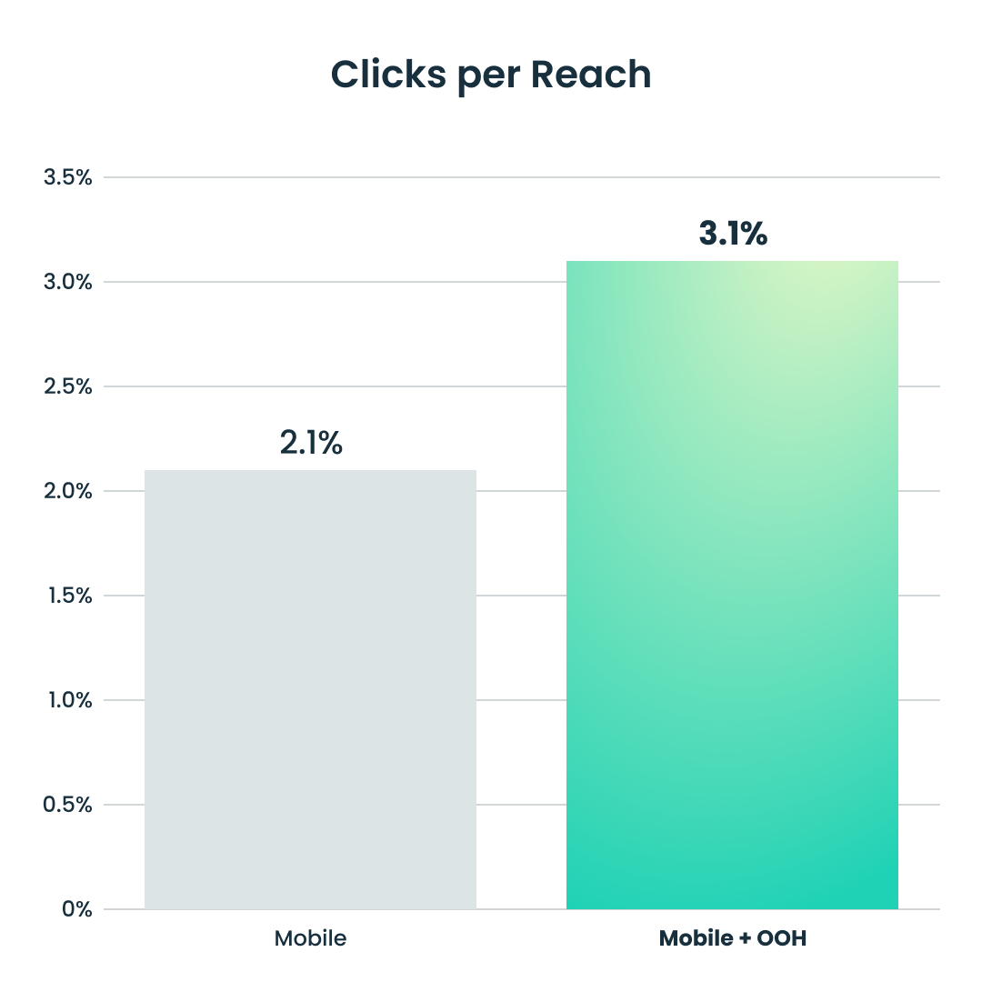 Our insights team discovered that Mobile campaigns supported by DOOH saw a significant increase in online engagement, proving the impact of real-world visibility as a part of an omnichannel strategy. What’s more, Clicks per Reach isn’t just measuring click quantity. It’s measuring how many clicks per individual who saw your ad, which translates to better spend efficiency per engagement. When you’re paying for impressions, higher Clicks per Reach equals more bang for your buck.