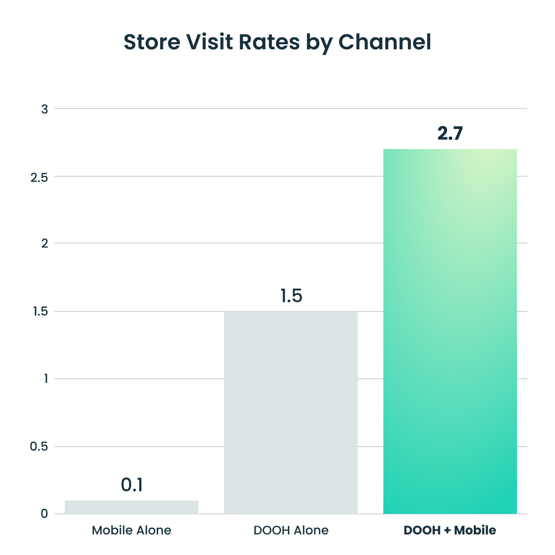 Increased reach and real-world visibility makes a serious difference in driving real business results, like foot traffic. According to GroundTruth Insights, campaigns leveraging both DOOH and Mobile yielded a higher Store Visitation Rate than either channel on their own.