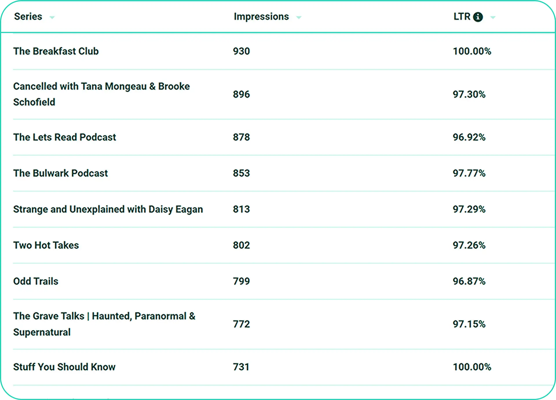 - Podcast genres (business, health, sports, etc.)
